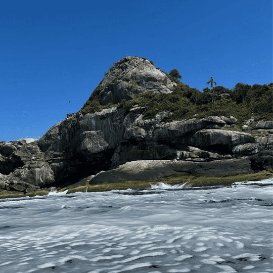 O roteiro segue em passeio de barco até o arquipélago das Ilhas Tijucas, passando pela Ilha Pontuda, com sua gruta e visual impressionante, até a parada principal na Ilha Alfavaca, ideal para mergulho, contemplação e fotos inesquecíveis.